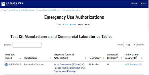 北京时间5月5日晚,顶点娱乐生物新型冠状病毒核酸检测试剂盒获美国食品药品监督管理局(FDA)紧急使用授权(EUA, Emergency Use Authorizations),这是该产品继1月28日获得中国国家药监局(NMPA)注册认证、3月3日获得欧盟CE认证后,顶点娱乐生物获得的又一重要认证,将进一步助力公司服务全球新冠肺炎疫情防控。